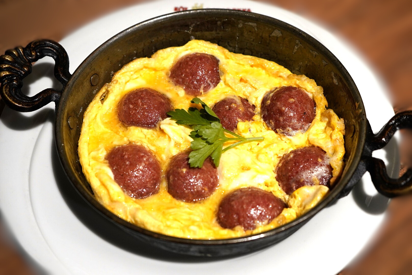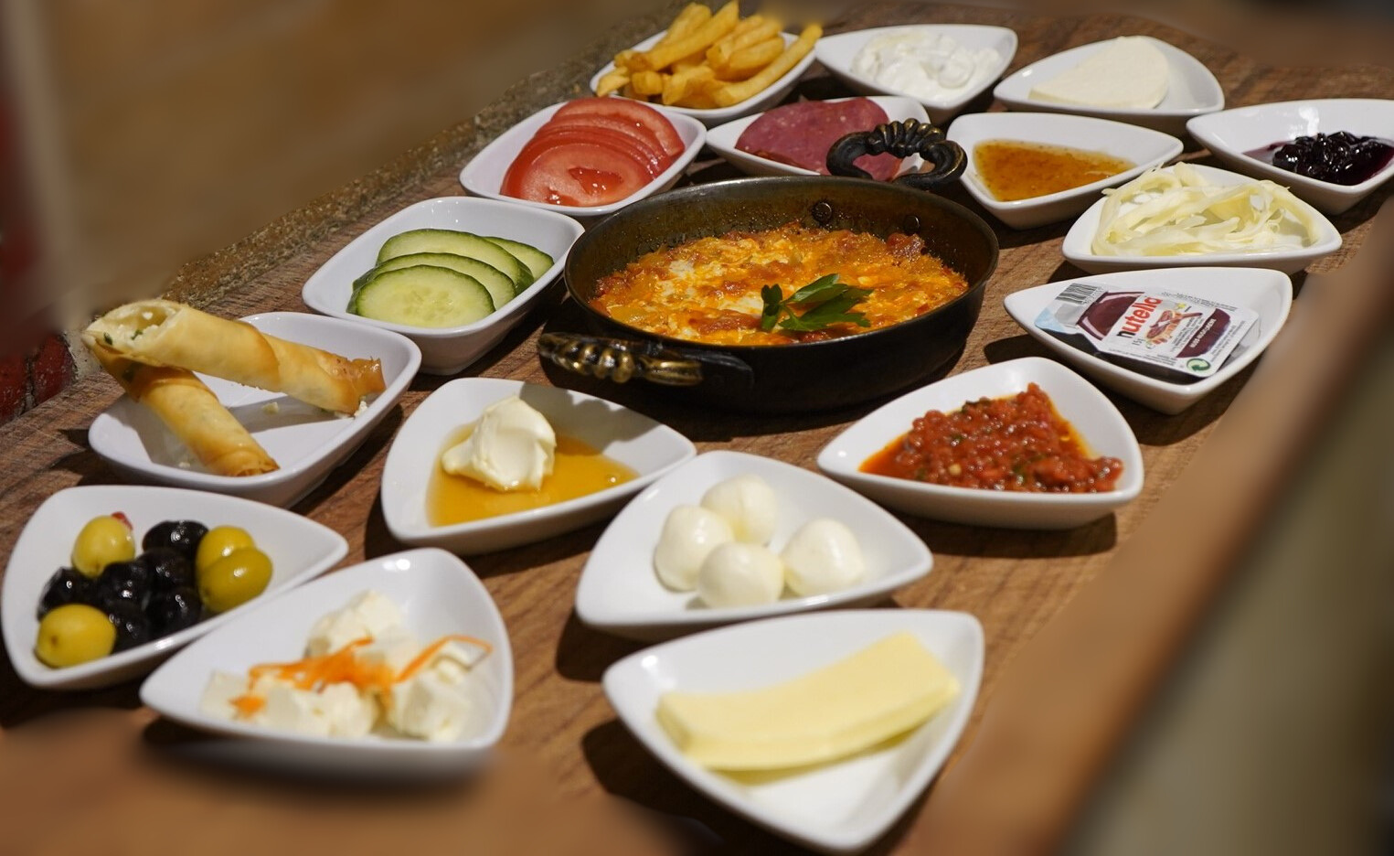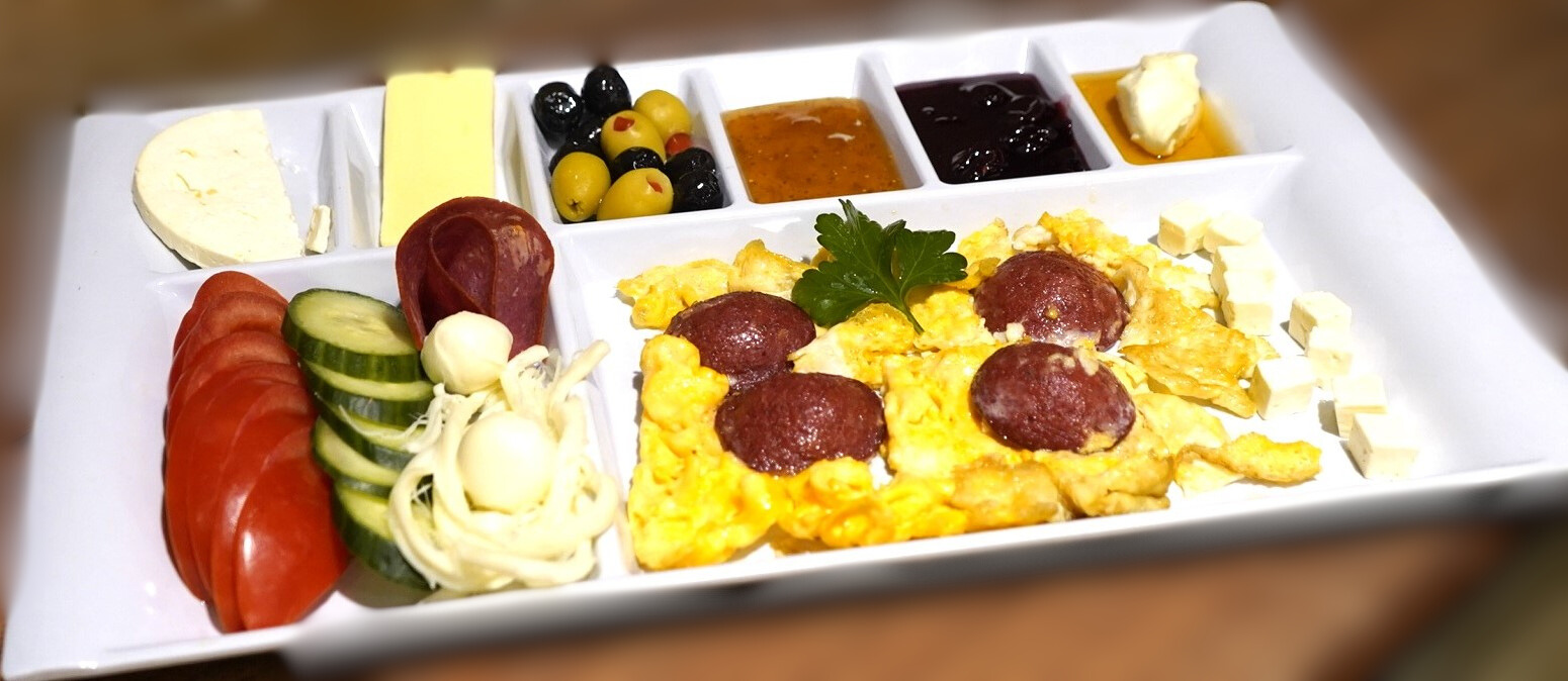 Our breakfast items: Cheese, cheese, spring rolls, mozzarella, sour cherry jam, fig jam, paste, haydari, french fries, bacon, clotted cream, fried eggs, green olives, black olives, tomatoes, cucumbers, honey, butter, Nutella, bread, eggs with sausage, menemen, 1 cup of coffee or tea. (See the Menu for prices.)